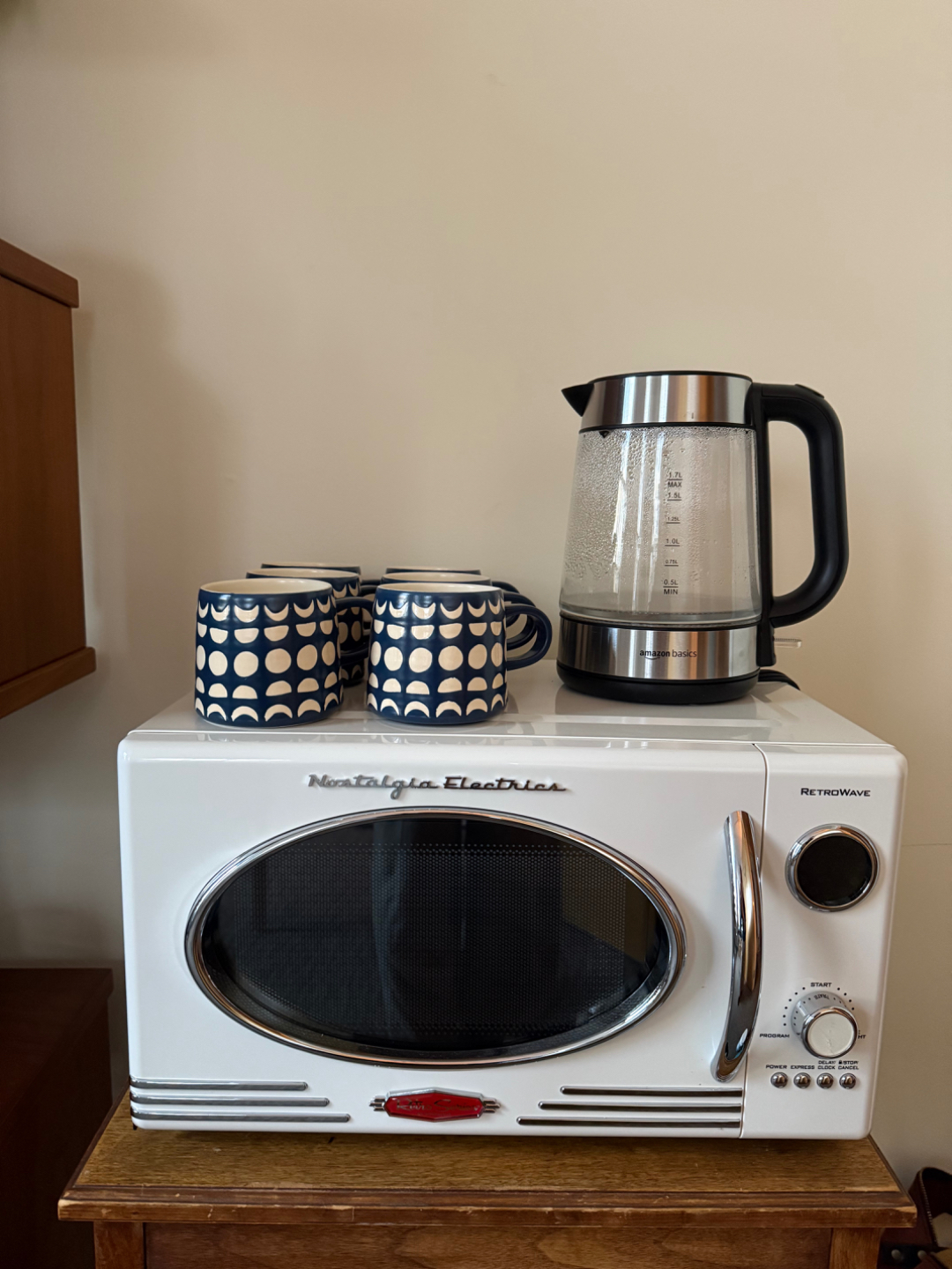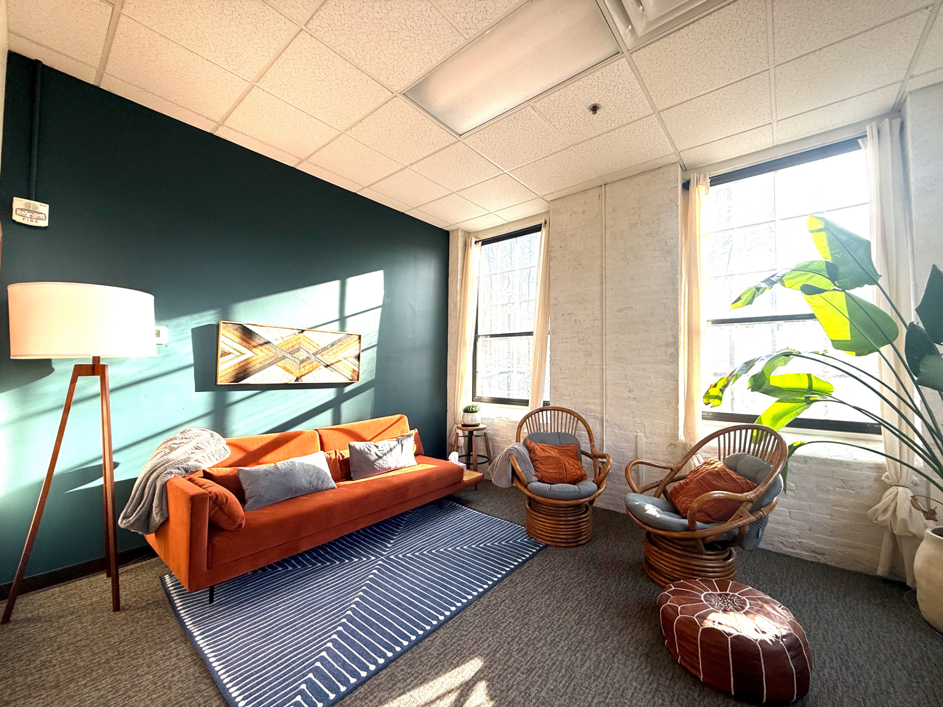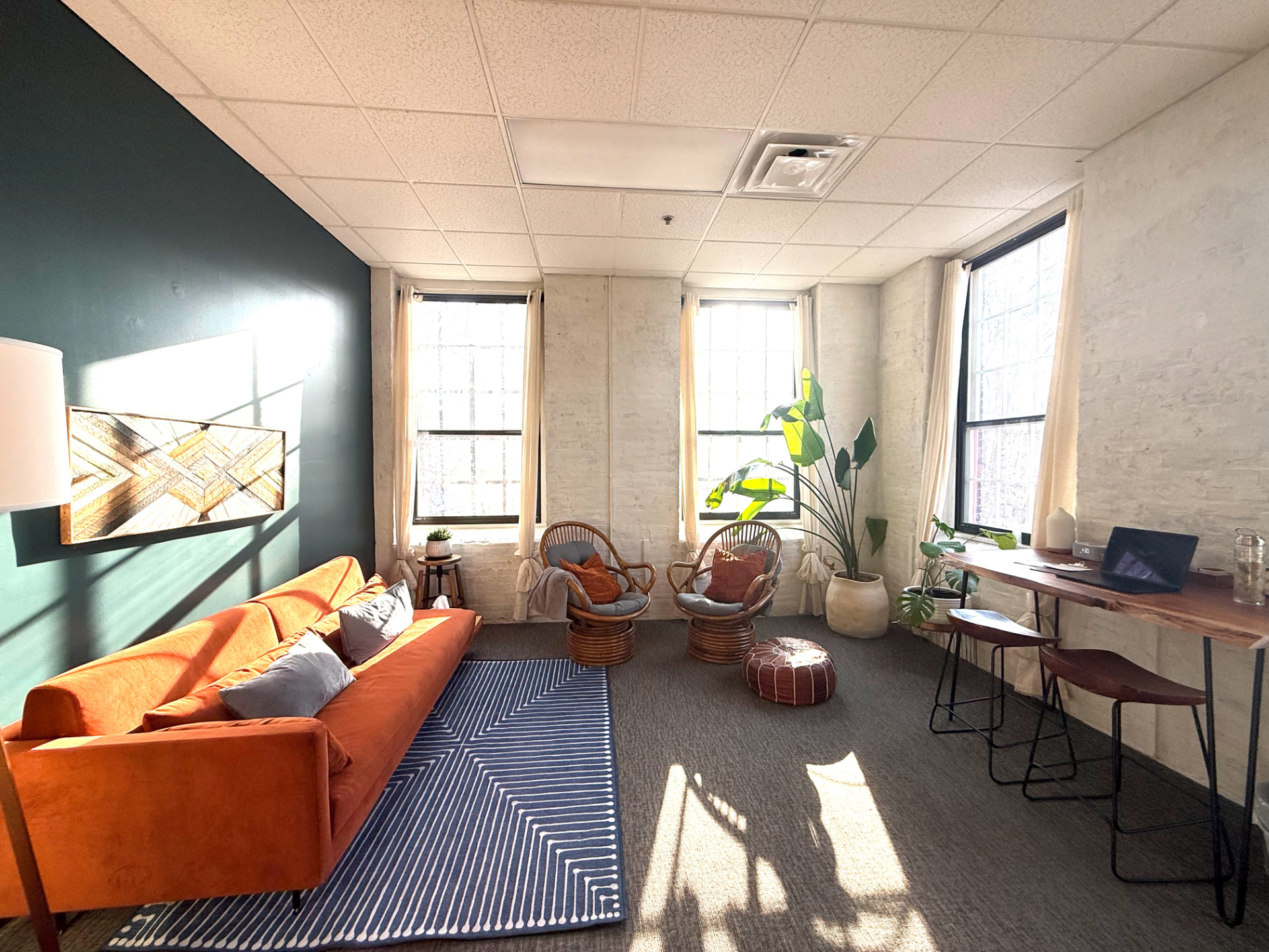 A bright, welcoming retreat with abundant natural light, comfortable seating for 6–10, a work desk, couch, seating area and a microwave—perfect for co-working, small gatherings, or a peaceful break between sessions.