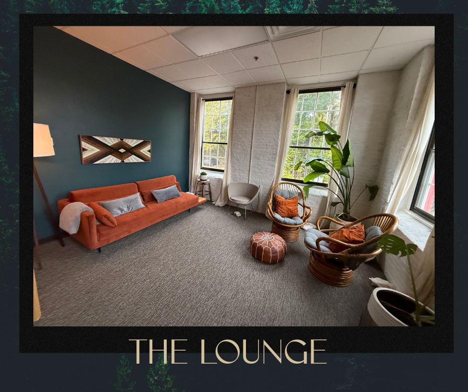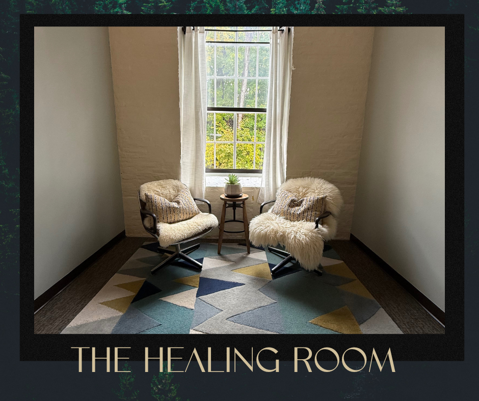 Capacity: 8–10 people. The Healing Room & The Lounge share a small waiting area.
